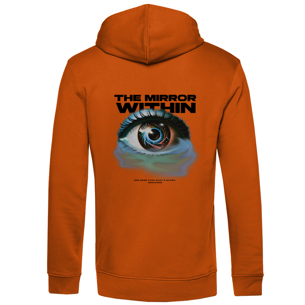 „Der Mirror Within Hoodie erinnert dich daran, tiefer zu blicken und deine innere Wahrheit zu leben. Gefertigt aus Bio-Baumwolle und recyceltem Polyester – weich, langlebig und nachhaltig. Das Eye-Design auf dem Rücken steht für Selbsterkenntnis und Klarheit.“